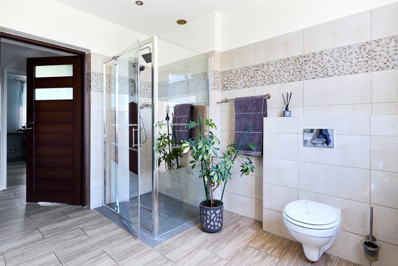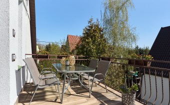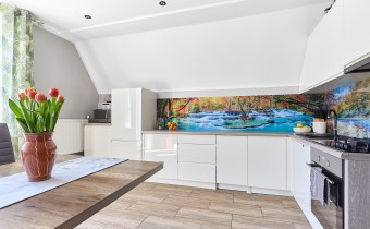 - na pierwszym poziomie: 2 pokoje, kuchnia z wyjściem na taras, łazienka z prysznicem, pomieszczenie gospodarcze