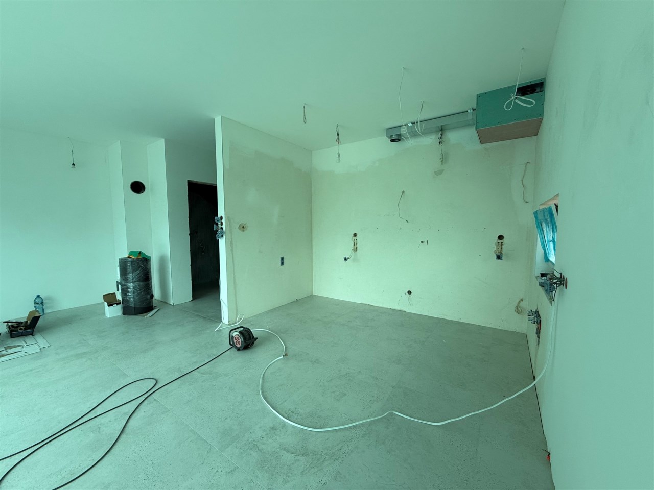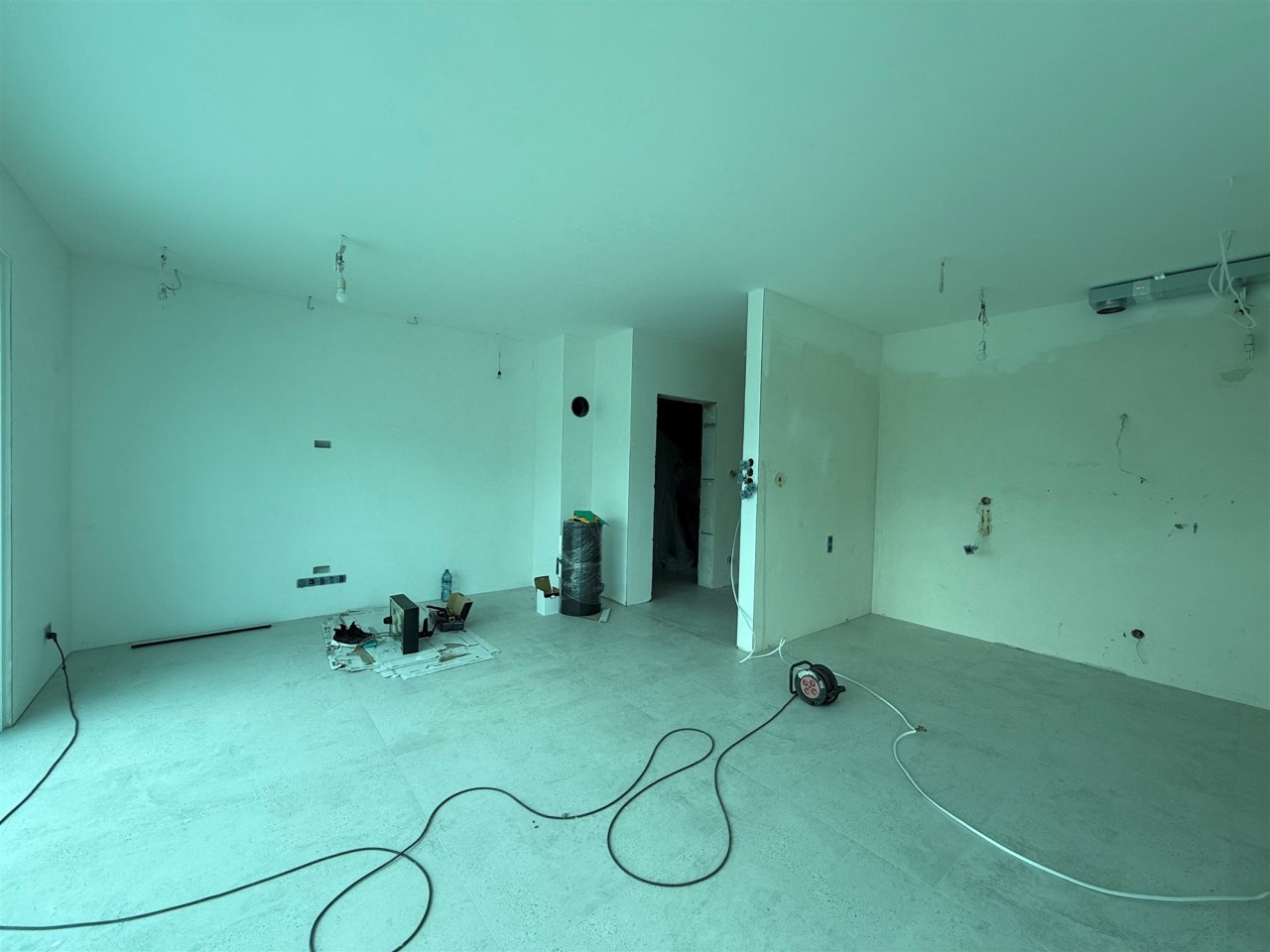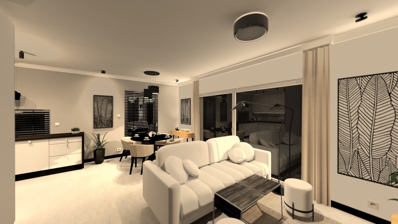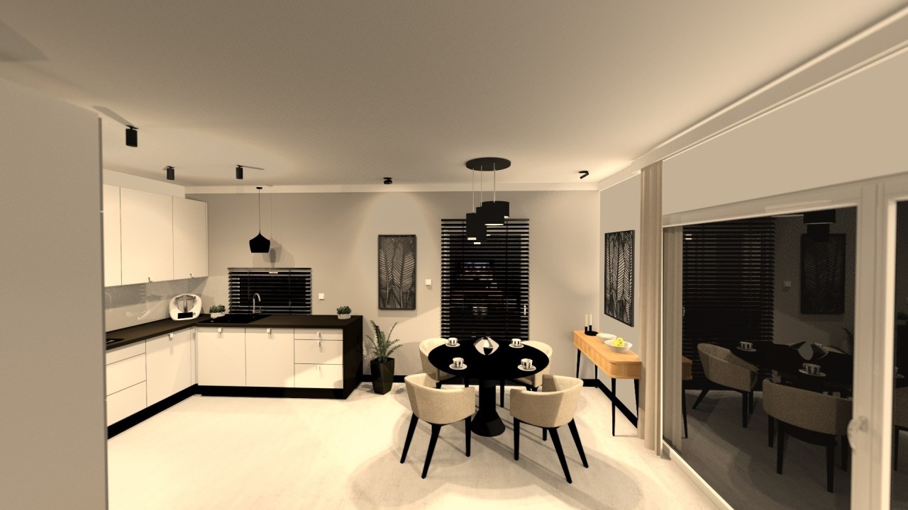 salon połączony z aneksem kuchennym, wyjście na duży taras, wc , z holu przejście do garażu.