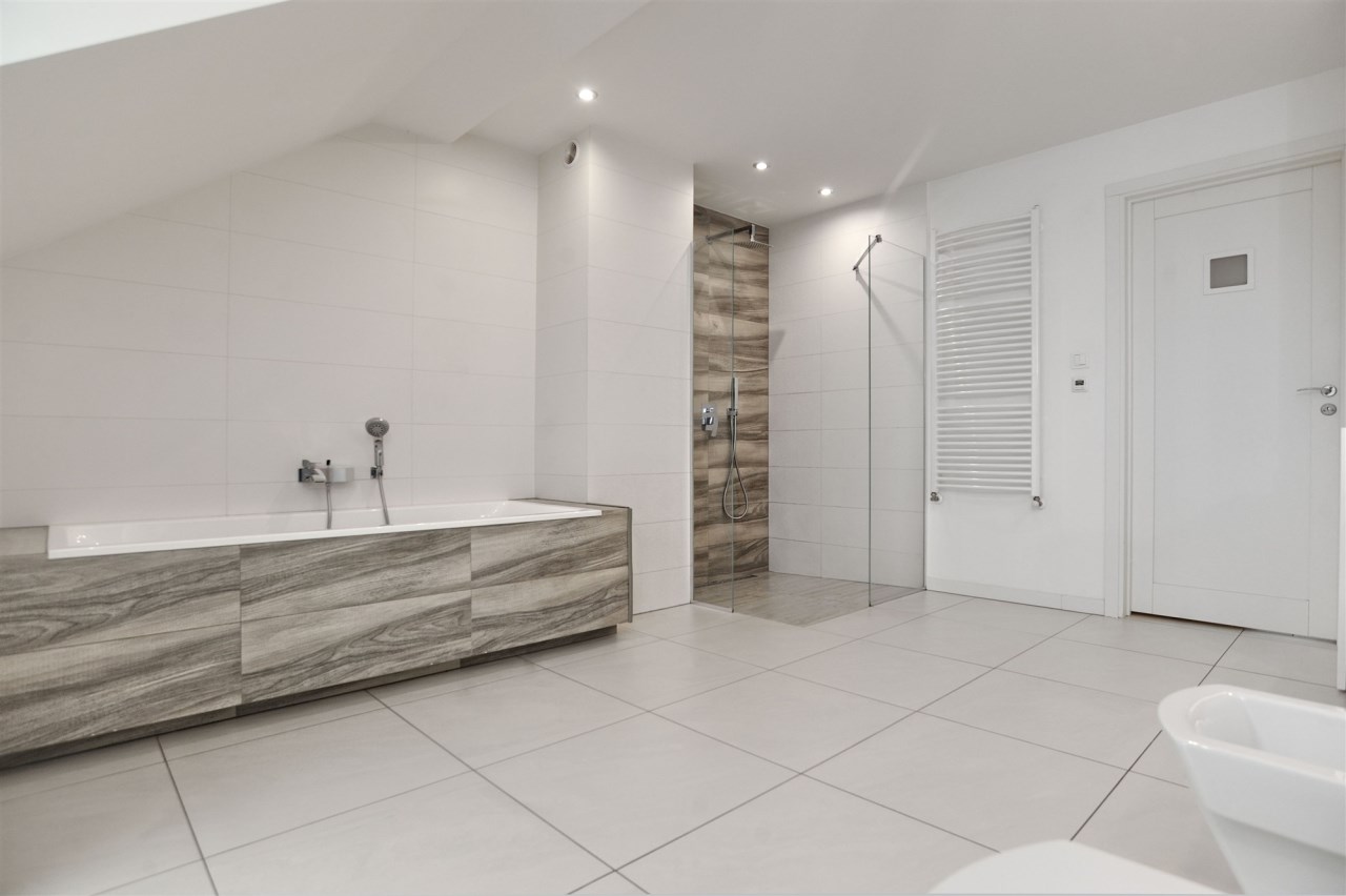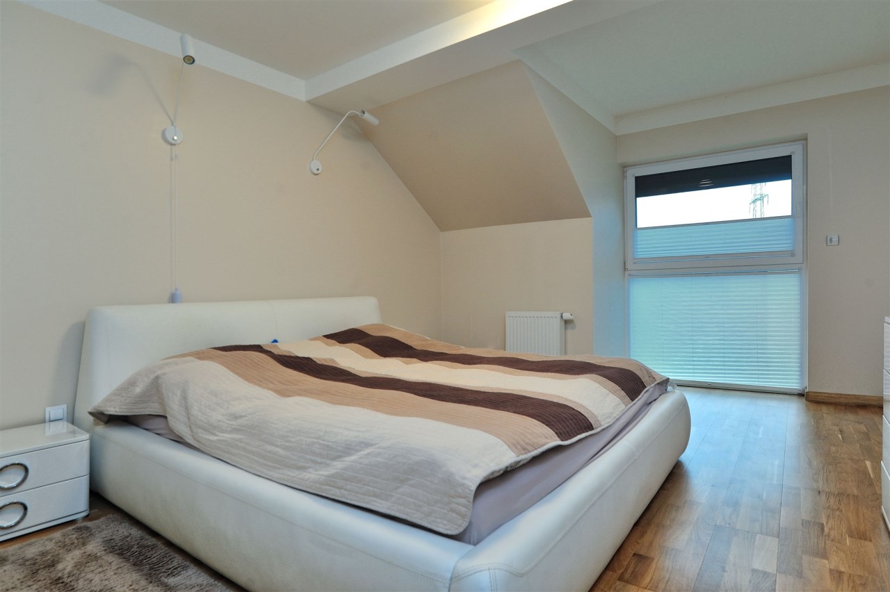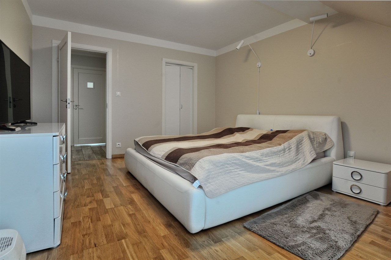 Piętro: trzy komfortowe sypialnie (jedna z garderobą), elegancka łazienka z wanną, prysznicem, bidetem i podwójną umywalką, wyjście na balkon z łazienki i sypialni.