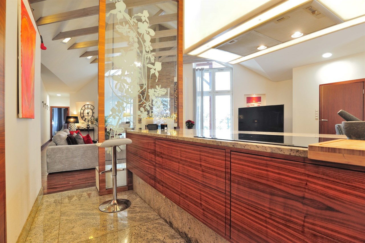 Duża nowocześnie zaaranżowana kuchnia z jadalnią i gabinet.