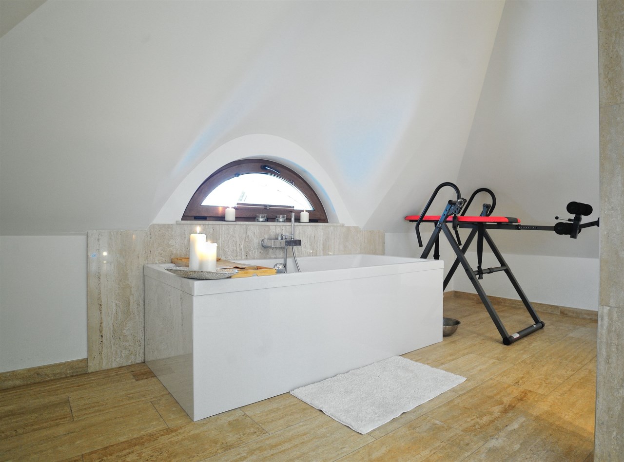 Pietro: sypialnia z oknem na ogród i garderobą, pokoj, zagospodarowany hol w z biblioteką i drugim biurem, oraz pokój kąpielowy.