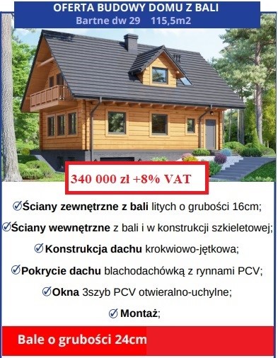 Przykładowy dom z bali w cenie 340000zł netto obejmuje konstrukcję z bali 24cm (możliwa konstrukcja z bali innej grubości co może dać cenę niższą lub wyższą w zależności od grubości), ściany wewnętrzne z bali i konstrukcji szkieletowej, dach konstrukcji krokwiowo jętkowej, pokrycie dachu blachodachówką z rynnami PCV, okna 3 szybowe PCV.