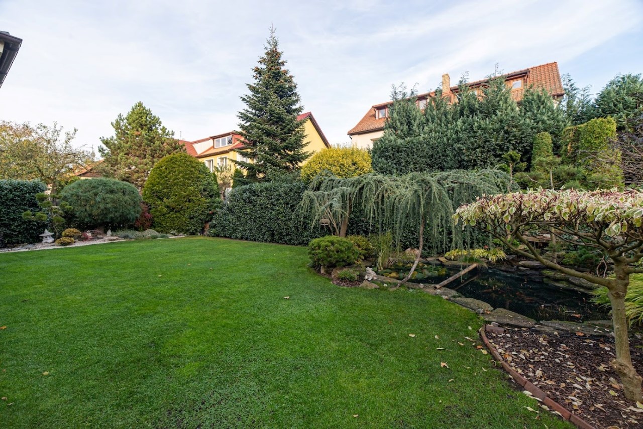 Nieruchomość usytuowana jest frontem do parku, na przepięknie zagospodarowanej działce o powierzchni 716 m² z oczkiem wodnym zarybionym, licznymi nasadzeniami i idealnie utrzymanym trawnikiem wyposażonym w automatyczny system nawadniania i robota koszącego.