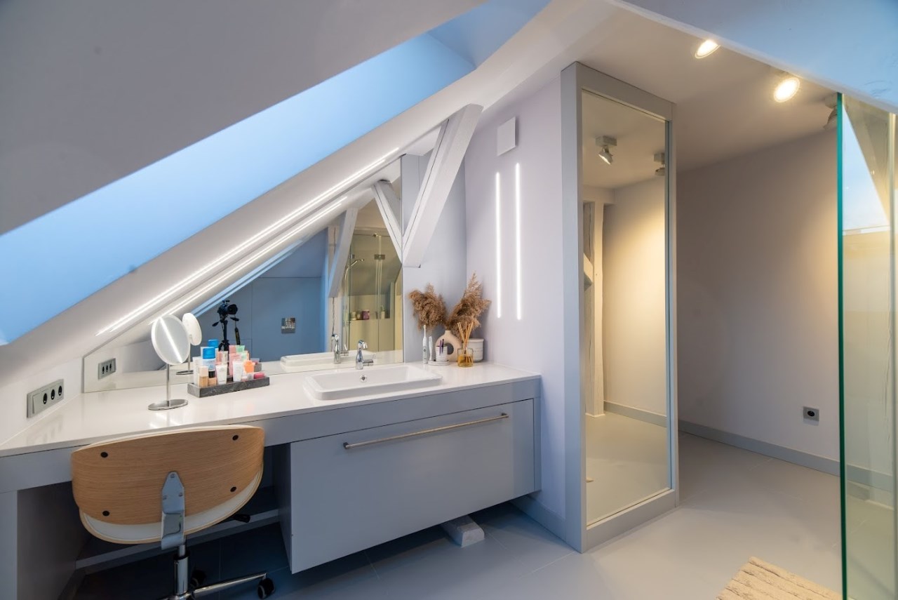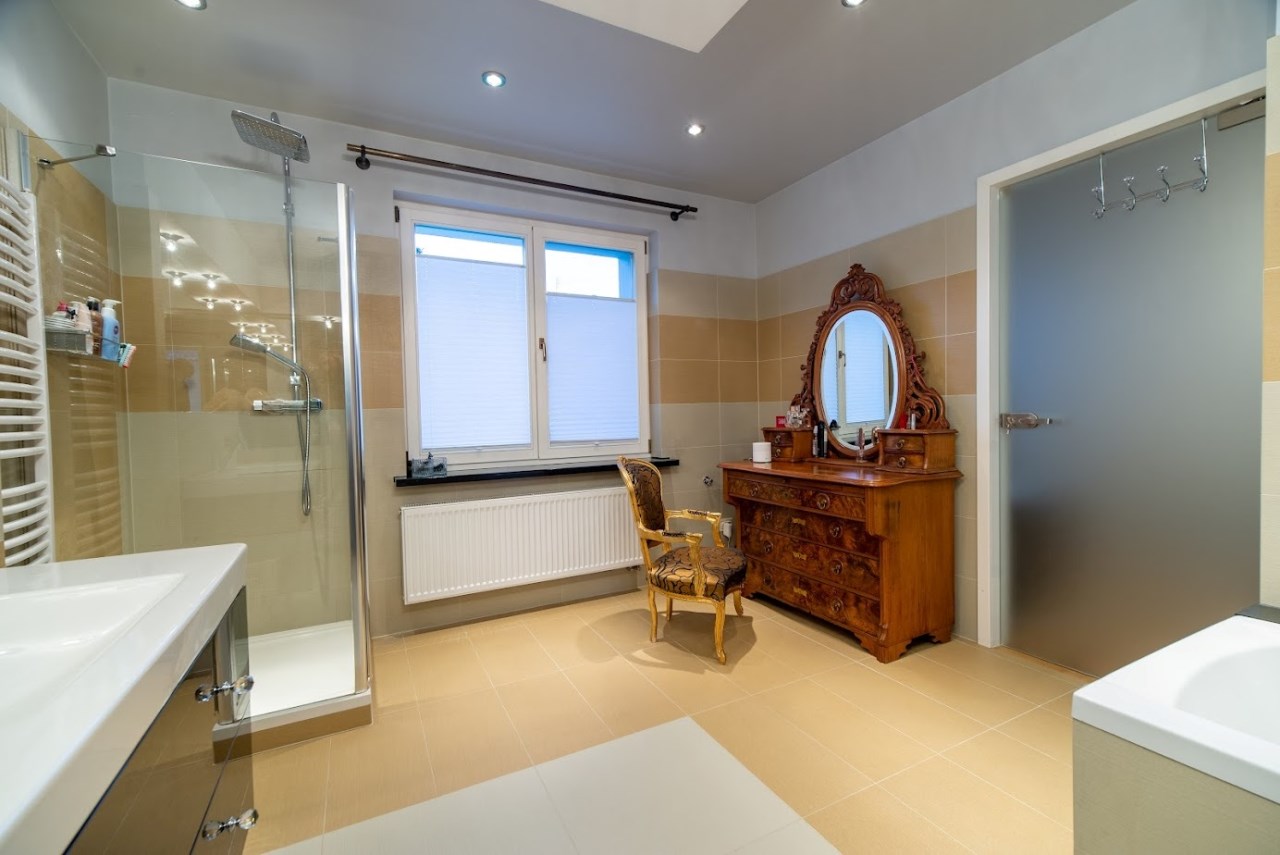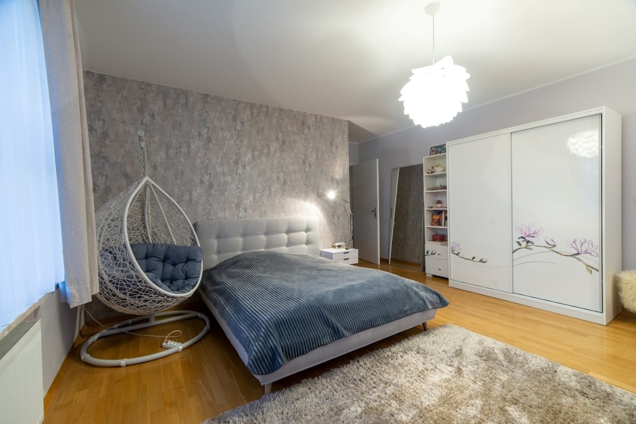 - Sypialnia typu master bedroom (z klimatyzacją) z prywatnym salonem kąpielowym, dużą garderobą i wyjściem na taras,