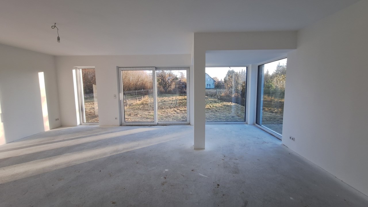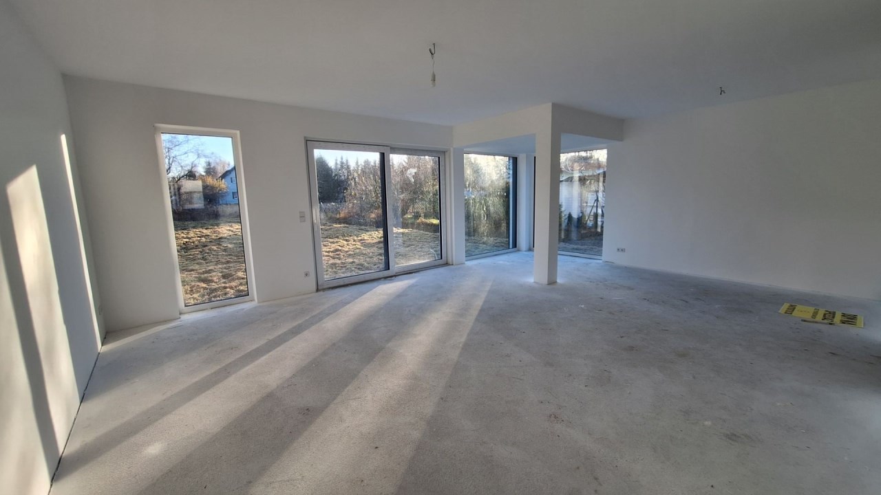 z wyjściem na taras i do ogrodu. Duże okna zapewniają dostęp naturalnego światła.