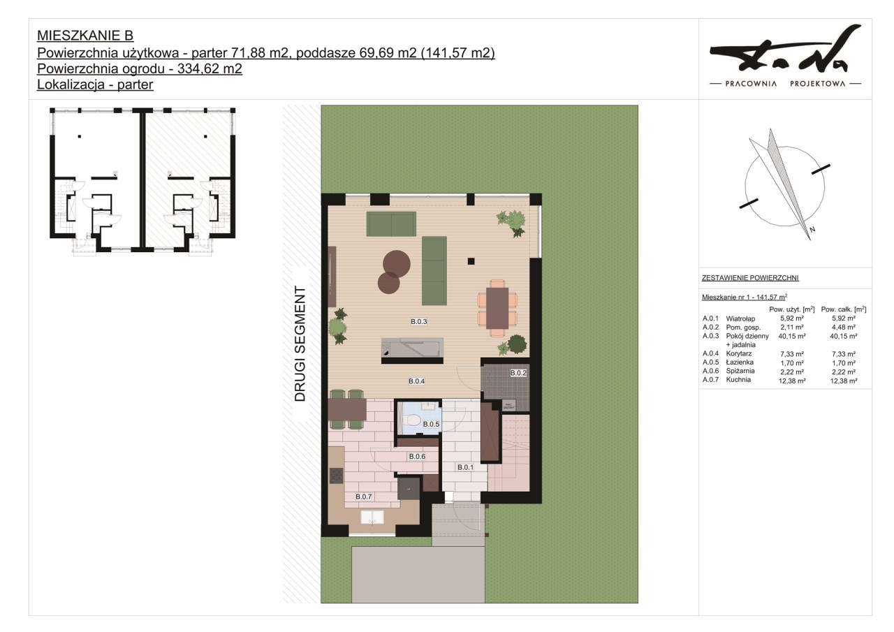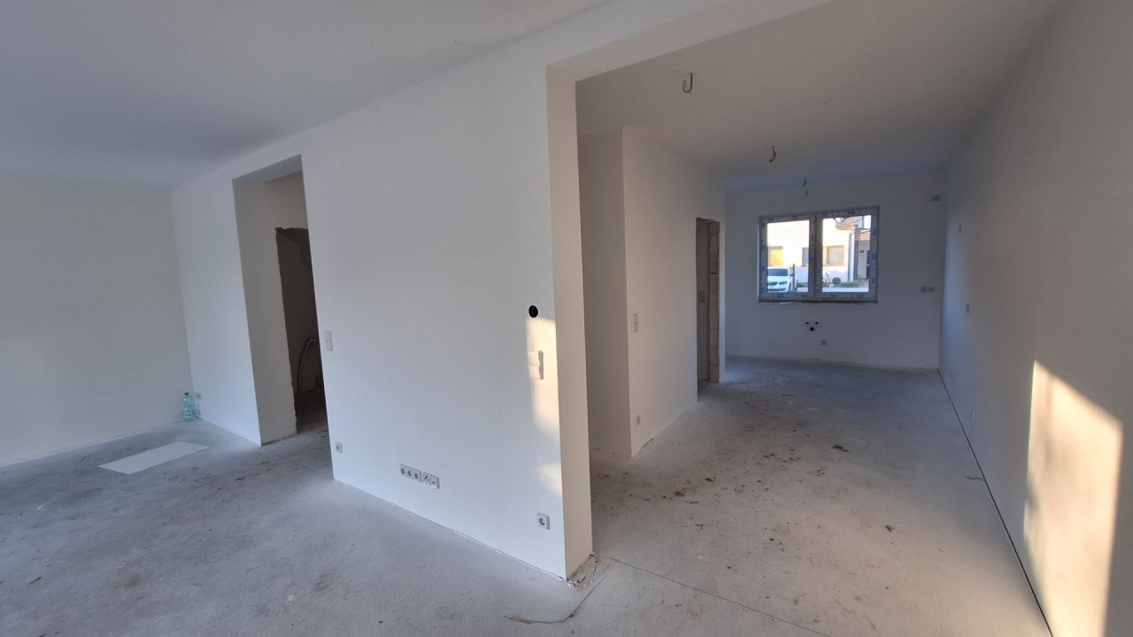 wiatrołap, łazienka, pomieszczenie gospodarcze, przestronny salon z aneksem kuchennym (spiżarnią) i jadalnią,