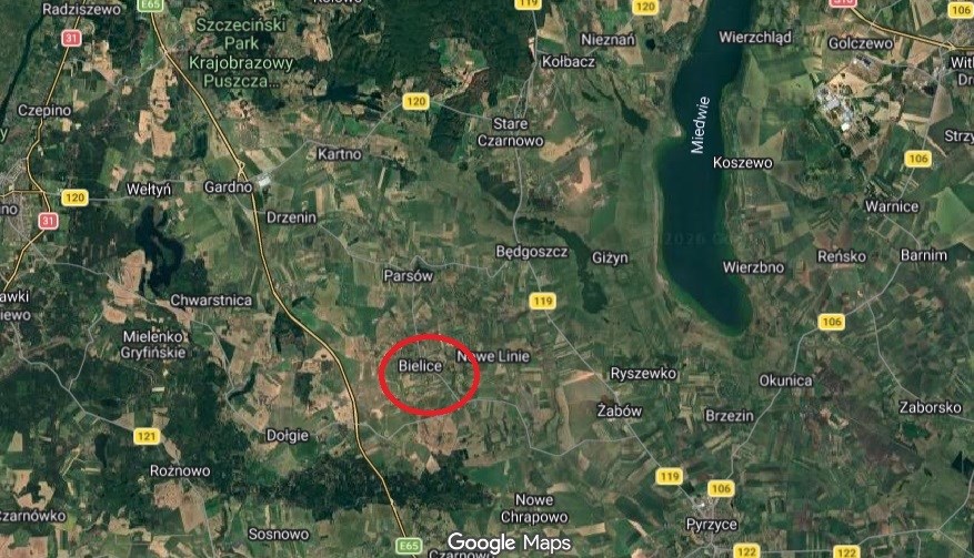 Kompleks działek budowlanych o powierzchniach 999/991/1128/1072/1049/1097/1202/1054/1135/1148/1140/1164/1167/1108/1114/1142/1095m2 w miejscowości gminnej Bielice pomiędzy miastami powiatowymi Szczecin, Gryfino, Pyrzyce, Stargard.Na działki wystawione były warunki zabudowy w 2025r.