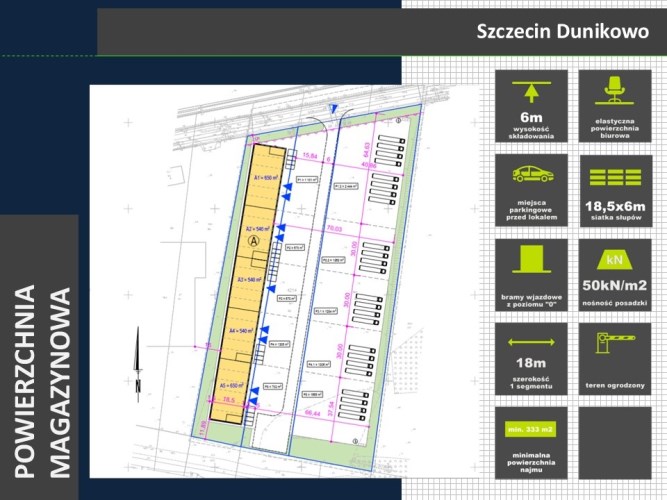 -Plac manewrowy przed budynkiem (w części odpowiadającej szerokości wynajętego segmentu) do wyłącznego korzystania przez Najemcę. Możliwość najmu dodatkowej powierzchni na placu składowym vis a vis obiektu.