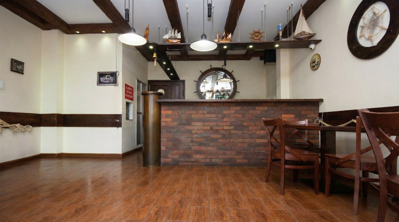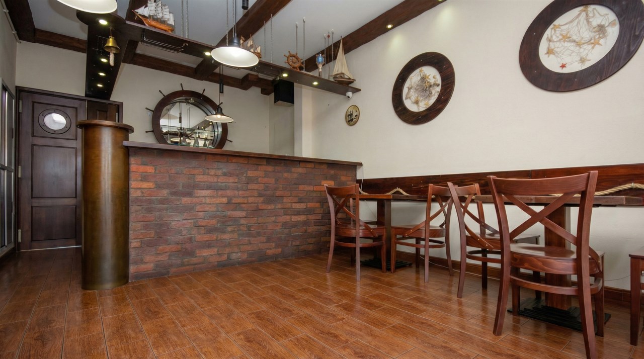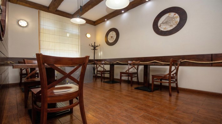 Tawerna wykończona została w nadmorskim stylu, z dominującymi elementami drewna w odcieniach ciemnego koloru, które podkreślają żeglarski klimat wnętrza i tworzą spójną, ciepłą atmosferę. Restauracja może jednocześnie przyjąć około 30 gości, a w sezonie letnim dodatkowe 8 miejsc dostępnych jest w ogródku zewnętrznym.