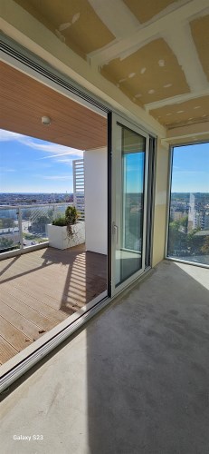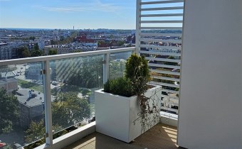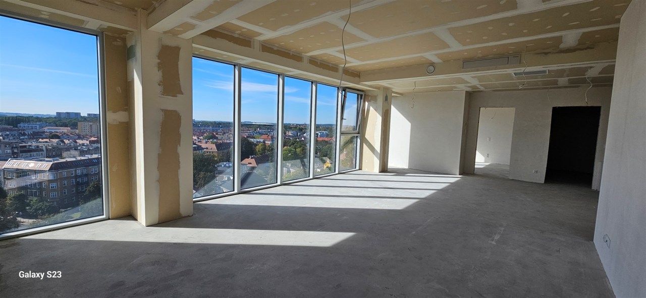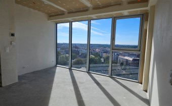 Z przestronnego tarasu rozpościera się niezwykły widok na panoramę miasta. Wnętrze apartamentu jest funkcjonalne, komfortowe i jasne, a dzięki panoramicznym przeszkleniom pomieszczenia są doskonale doświetlone.