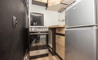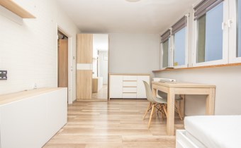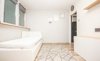 - jednego pokoju z duża szafą, łóżkiem i miejscem do jedzenia