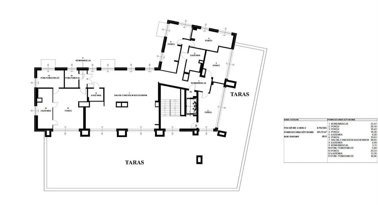 Oferta sprzedaży wyjątkowego apartamentu z widokiem na centrum Szczecina.Powierzchnia mieszkalna 261 m2, dodatkowo taras 319 m2, 3 balkony o pow. 2,73 m2 każdy, 3 miejsca postojowe plus 2 pomieszczenia gospodarcze.