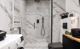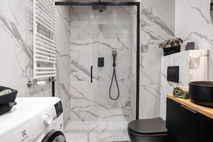 Wyposażenie łazienki WC, umywalka, pralka, lustro, kabina prysznicowa