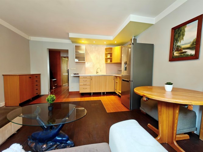 Mieszkanie przeszło generalny remont od podstaw ok. 13 lat temu – wymieniono instalacje, położono nowe podłogi, wykonano gładzie, wstawiono okna PCV i drzwi wewnętrzne. Balkon typu loggia został włączony do powierzchni mieszkania, co zwiększyło metraż o ok. 3 m². Odnowiono również kuchnię i łazienki, a wszystkie prace wykonano solidnie i estetycznie.