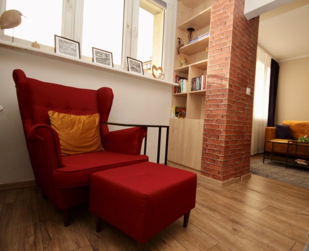 Mieszkanie znajduje się na pierwszym piętrze. Jest jasne, słoneczne, z pięknym popołudniowym i zachodzącym światłem wpadającym do wnętrza. Okna wychodzą na zielone, zamknięte podwórko, co zapewnia ciszę i prywatność.
