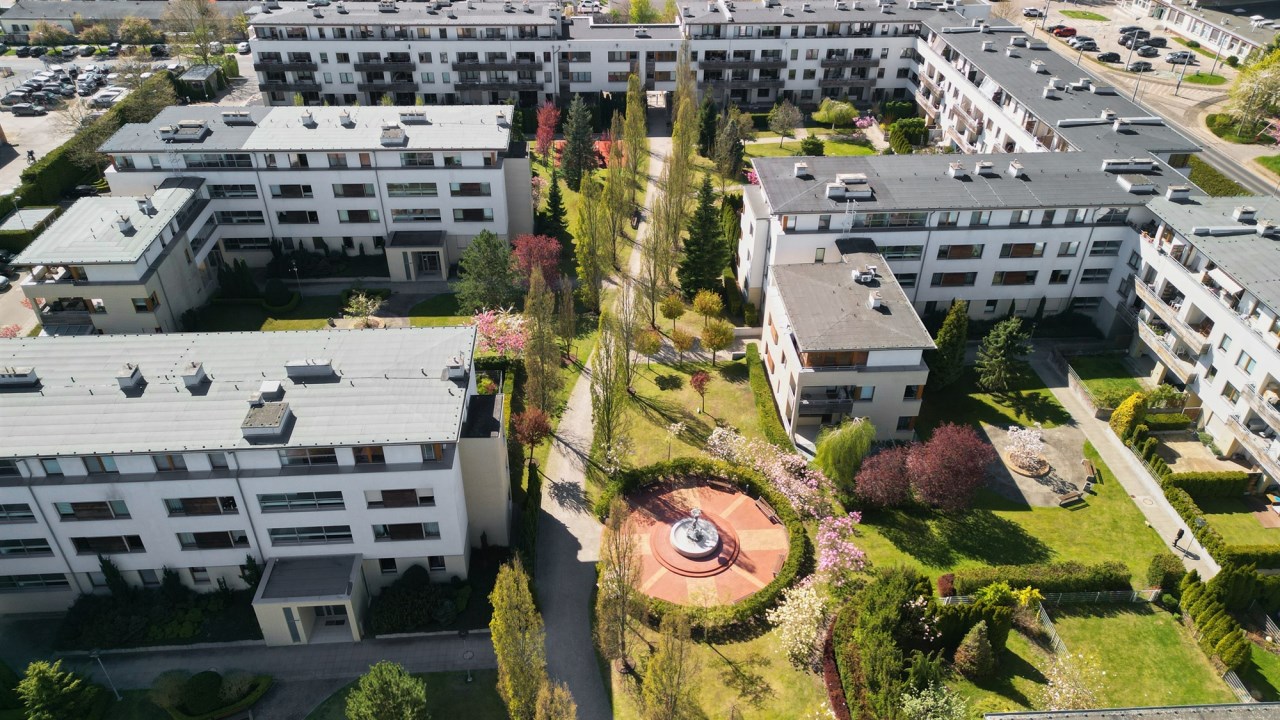 - Infrastruktura: Na terenie osiedla mała architektura ogrodowa, place zabaw, drzewa i krzewy.