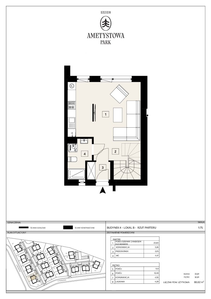 Prezentowany lokal ma powierzchnię użytkową 66,62 m2, liczoną zgodnie z prawem bez wliczania powierzchni pod ściankami działowymi. Do wyłącznego korzystania przez właścicieli jest ogródek o powierzchni ok. 96 m2.