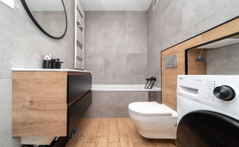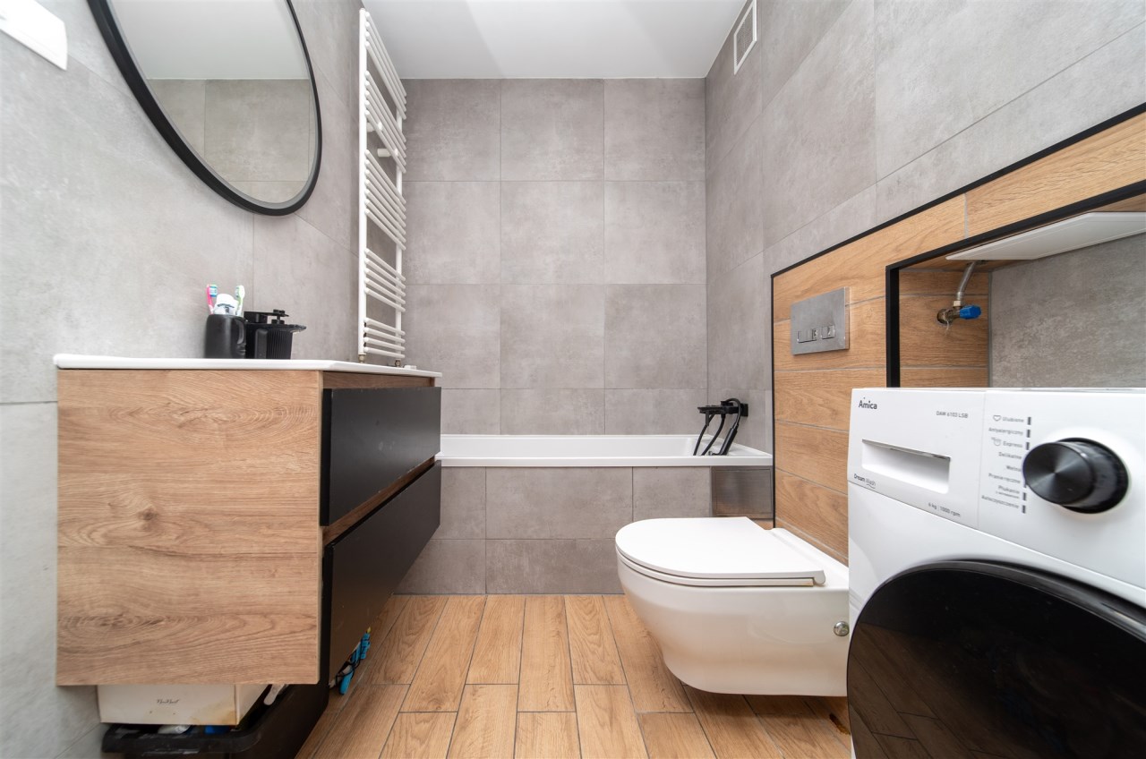 Łazienka z wanną, szafa w przedpokoju. Kuchnia w pełnej zabudowie z kompletem sprzętów AGD.