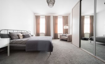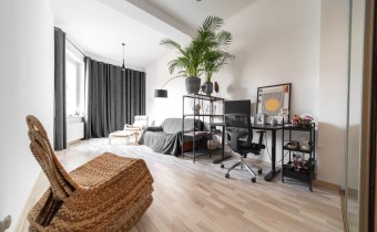 Wysoko, duże poczucie przestrzeni, dużo słońca. Przytulna sypialnia z głęboką wykładziną, zabudową oraz łóżkiem. Salon z jadalnią, częścią wypoczynkową oraz wyjściem na duży balkon. Trzeci pokój stanowi pracownia - ten pokój posiada drugą, prywatną łazienkę. Kuchnia z szerokim blatem oraz barkiem. Łazienka główna z dużą wanną. Widny oraz szeroki przedpokój.