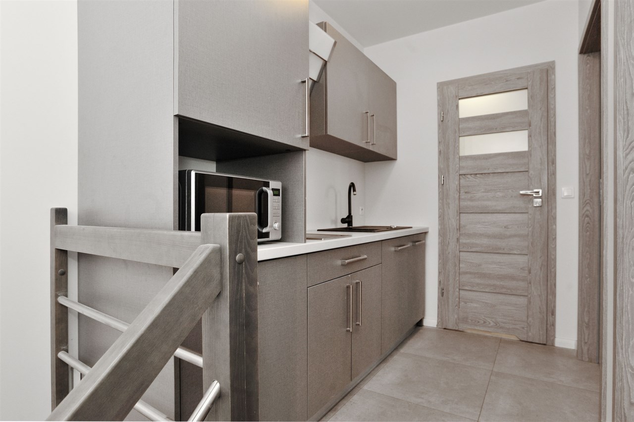 II poziom, dwie sypialnie z wyjściem na taras, łazienka z kabiną prysznicową oraz aneks kuchenny w korytarzu.