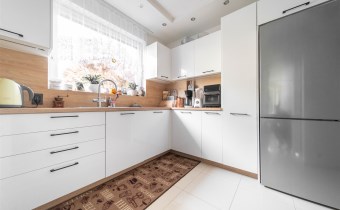 Kuchnia w nowoczesnej zabudowie, ze sprzętem AGD. Salon z kominkiem, jasny z ładnie zaprojektowanym oświetleniem. Na tym poziomie znajduje się również toaleta z umywalką. Z poziomu 0 schodami wchodzimy na 1 piętro o powierzchni 37 metrów. Znajdują się tam dwie duże sypialnie, każda z balkonem oraz duża łazienka/pokój kąpielowy z prysznicem i wanną.