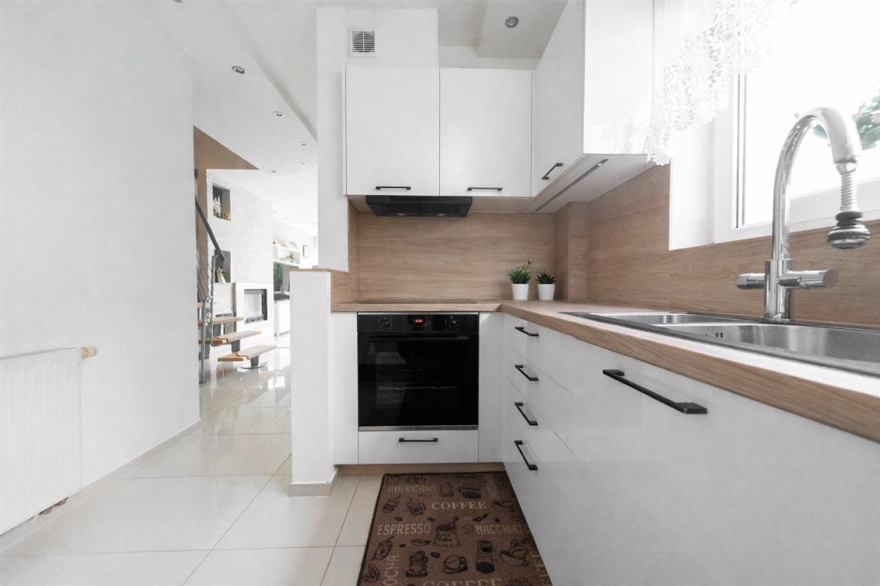 Kuchnia w nowoczesnej zabudowie, ze sprzętem AGD. Salon z kominkiem, jasny z ładnie zaprojektowanym oświetleniem. Na tym poziomie znajduje się również toaleta z umywalką.