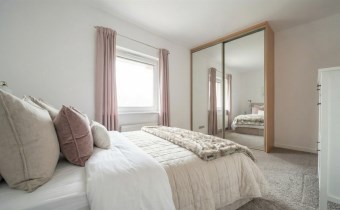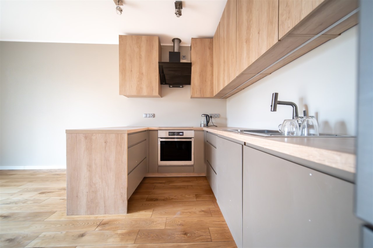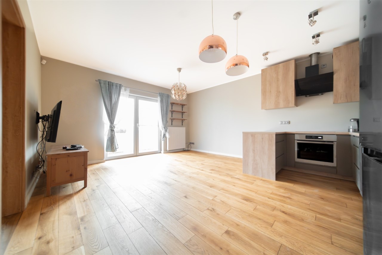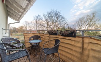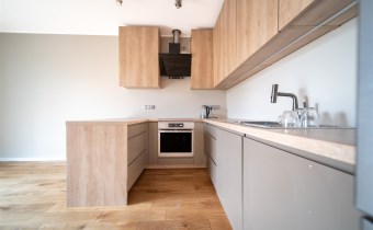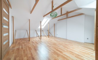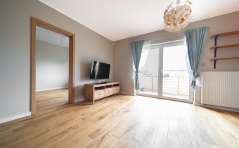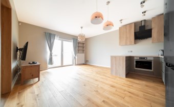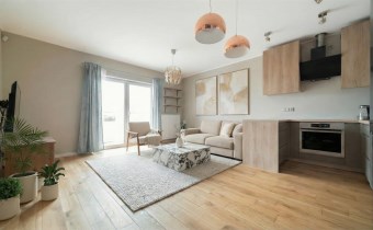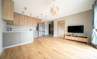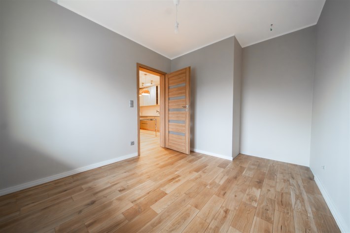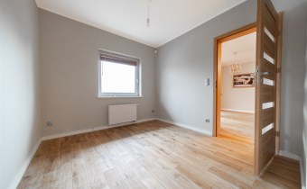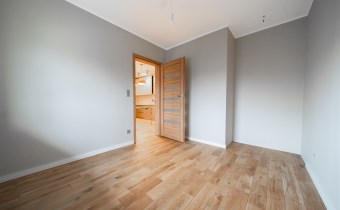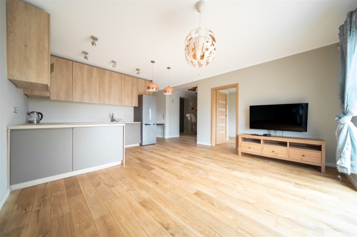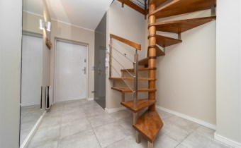 Mieszkanie wykończone w wysokim standardzie, z dbałością o detale i funkcjonalność. Dębowa podłoga oraz schody, nowoczesne oświetlenie, kuchnia wykonana na zamówienie, instalacja alarmowa. Zabudowy stałe – w przedpokoju oraz sypialni głównej – również robione na wymiar.
