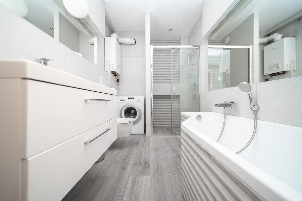 Łazienka wyposażona zarówno w wannę, jak i prysznic. Z salonu wyjście na taras przez szerokie drzwi otwierane na zasadzie wrót, co dodatkowo doświetla przestrzeń.