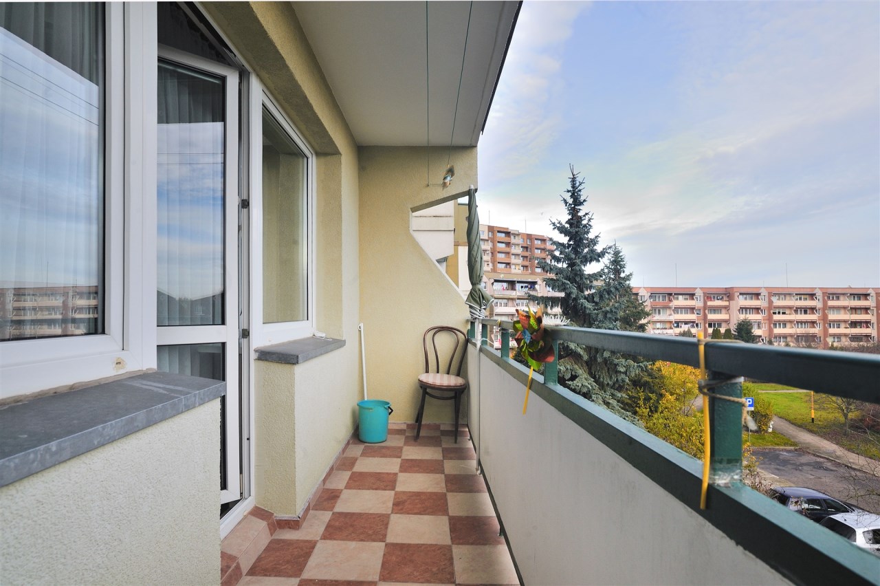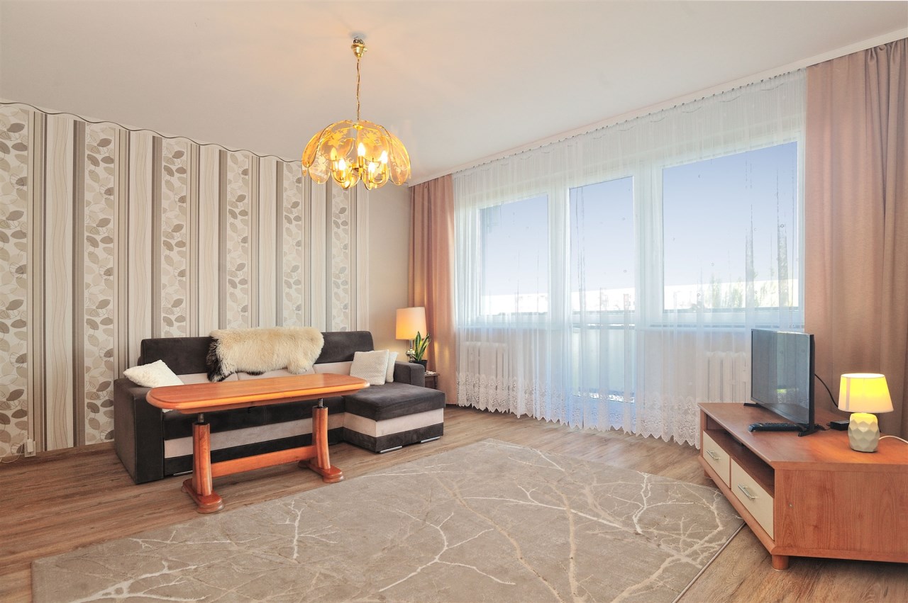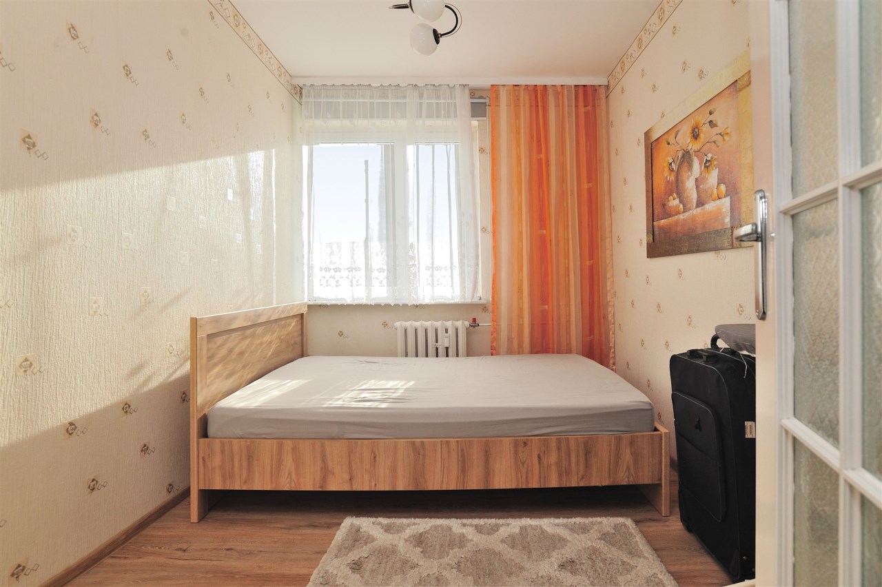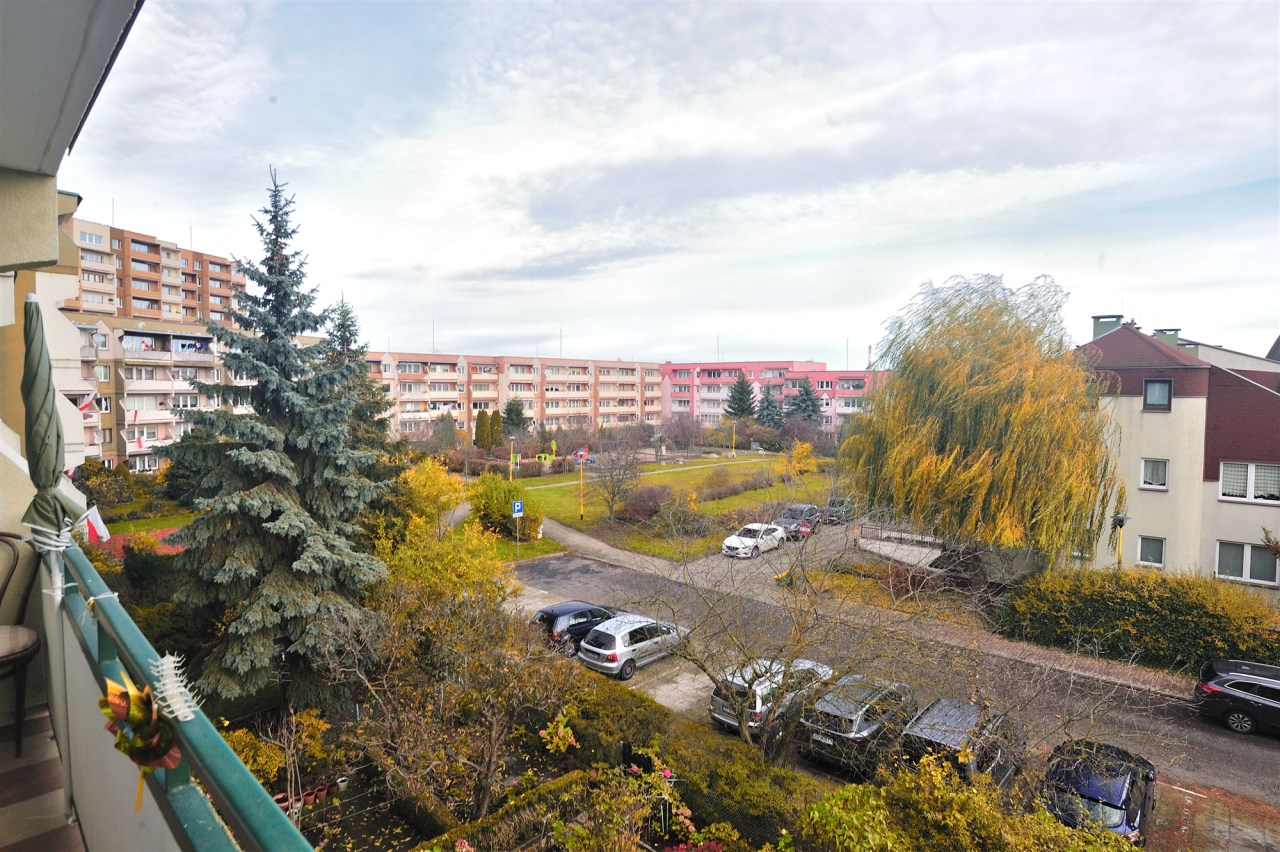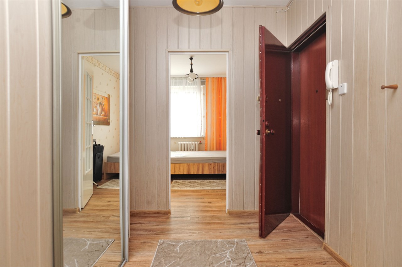 Pokój dzienny z balkonem, w holu szafa, sypialnia od strony południowej.