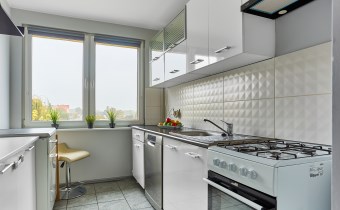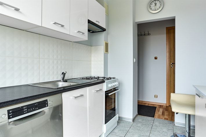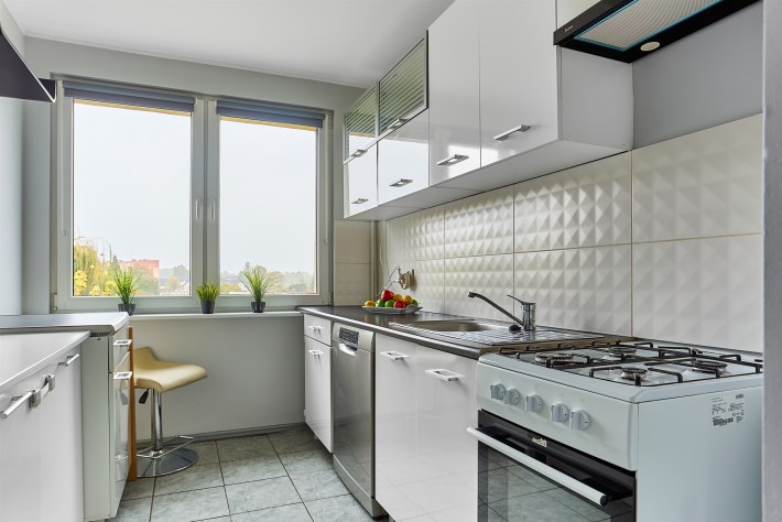 W kuchni znajdziemy meble, kuchenkę gazową, lodówkę, zmywarkę
