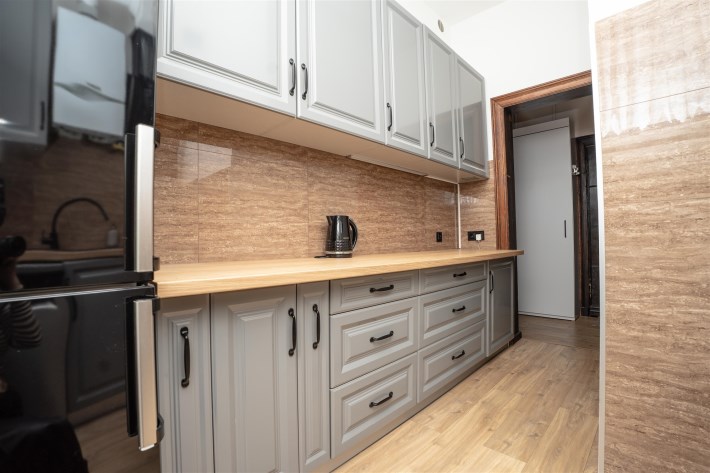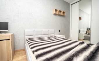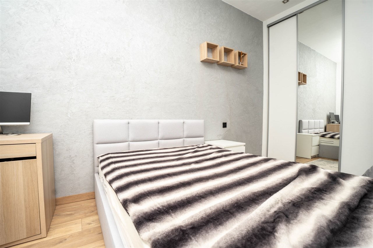 W salonie okrągły stol z krzesłami, rozkładana kanapa. W kuchni indukcja, zmywarka. Sypialnia z dużym łóżkiem oraz kącikiem do pracy (światłowód w całym mieszkaniu). Na jednej ścianie garderobiana szafa.