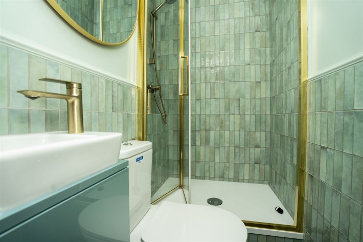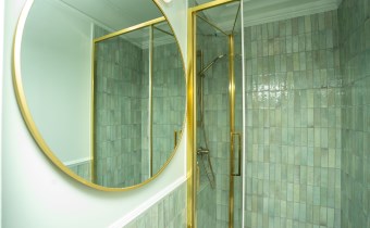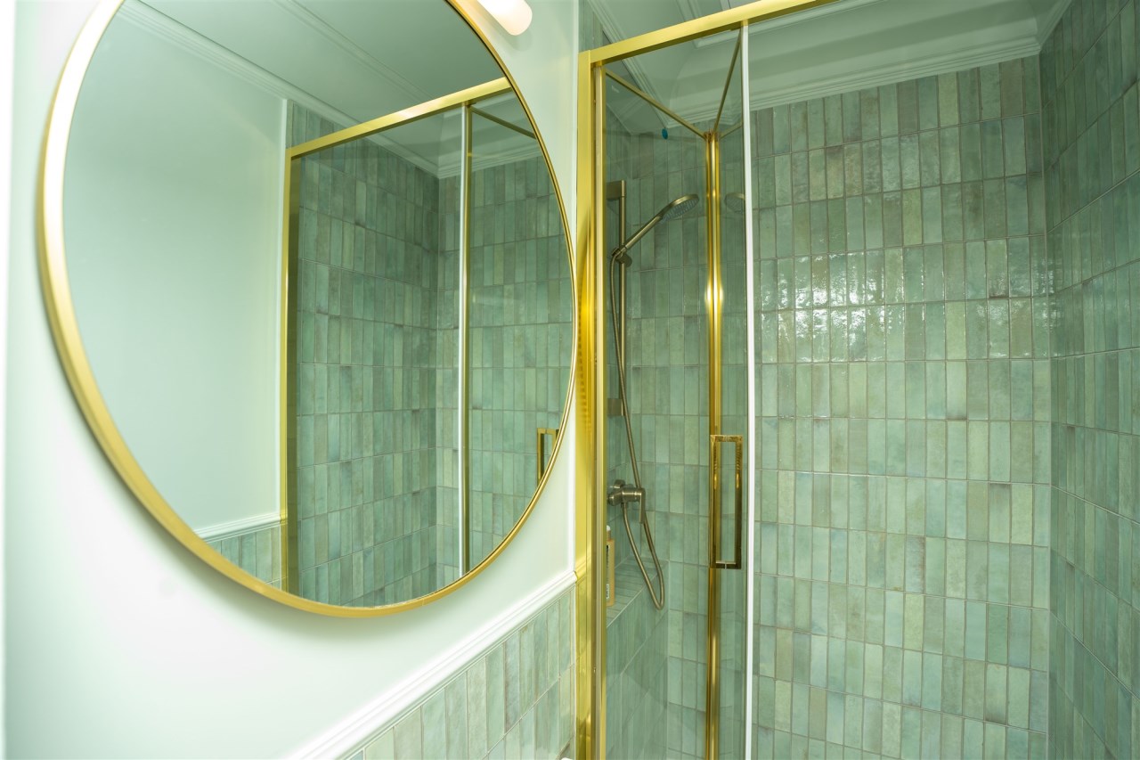 Łazienka w nowoczesnych kaflach z kabina prysznicowa, umywalka i dużym podświetlanym lustrem. Przedpokój w kwadracie z szafa ubraniową.