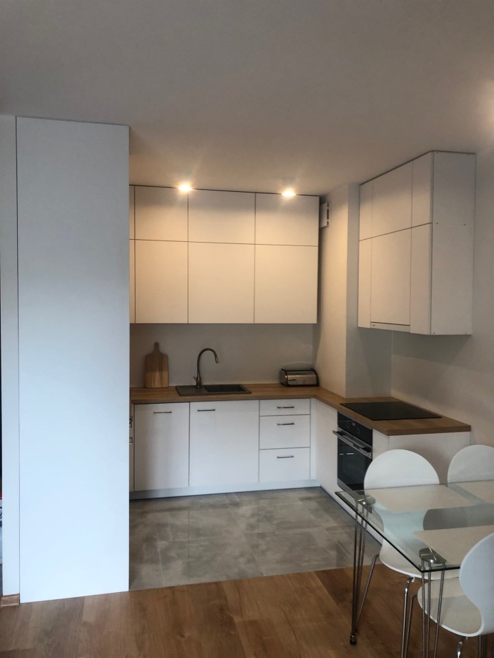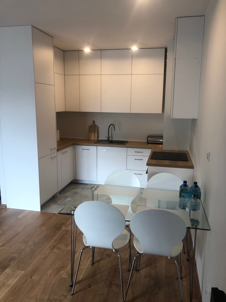 Kuchnia jest w pełni wyposażona – znajdziemy tu lodówkę, zmywarkę, piekarnik, płytę indukcyjną oraz komplet naczyń. W salonie znajduje się wygodna sofa i telewizor, tworzące idealną przestrzeń do relaksu.