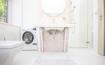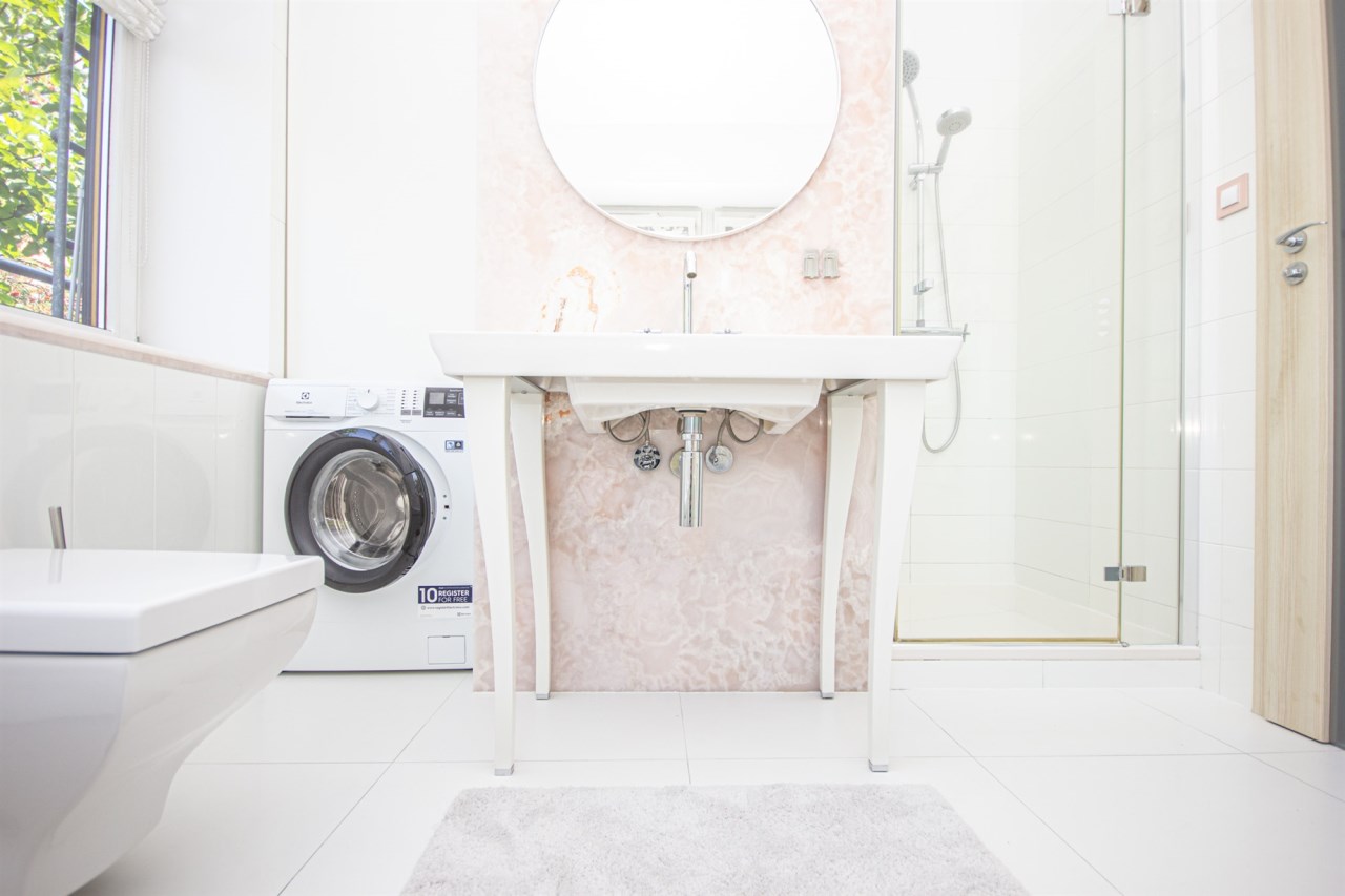 -łazienka z prysznicem, bidetem, toaletą, pralką w zabudowie