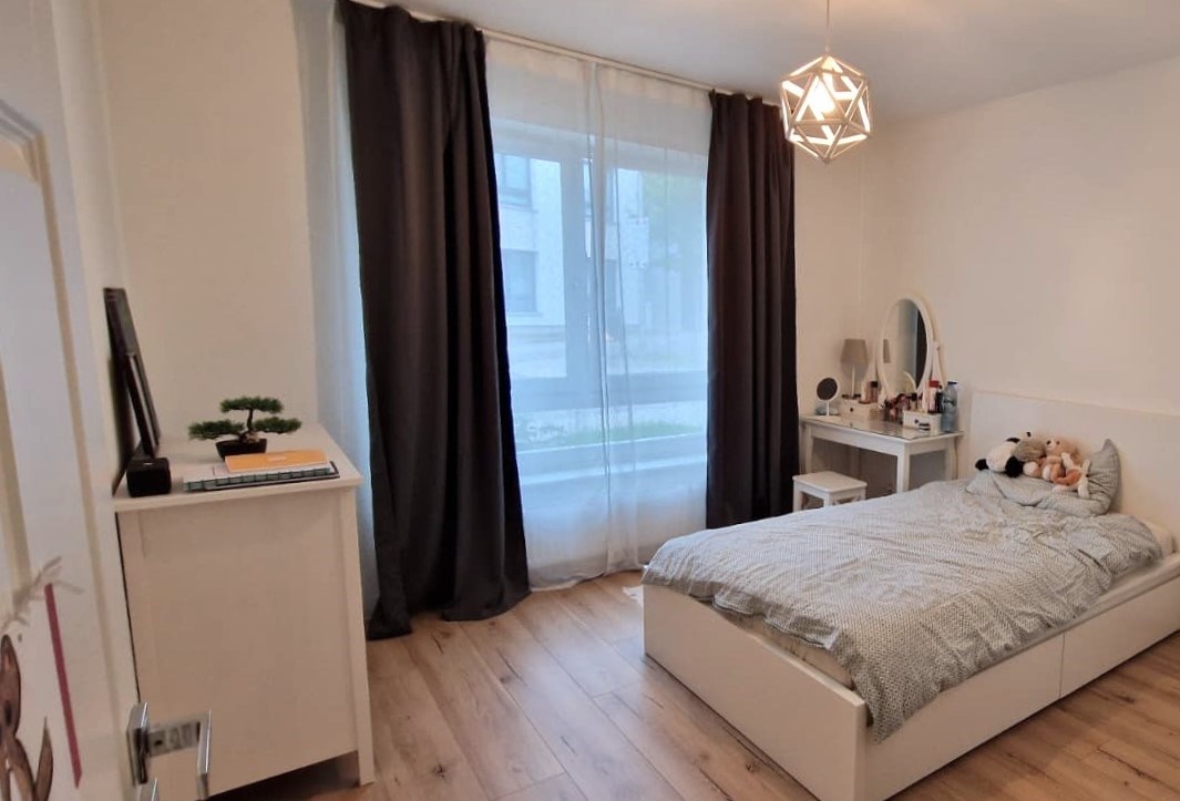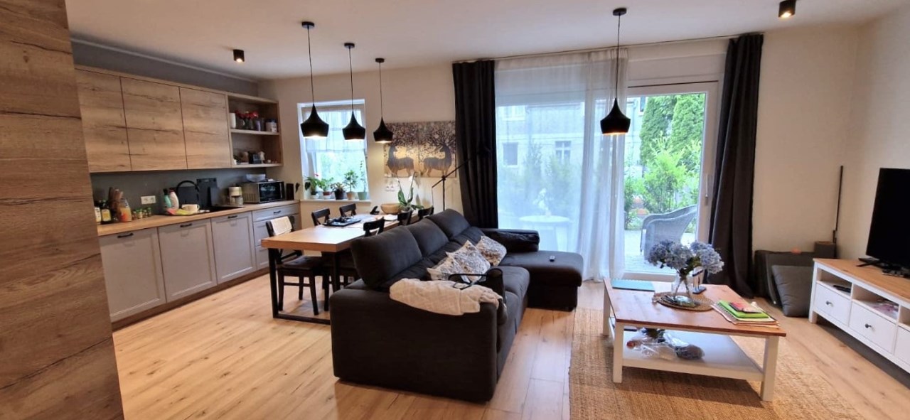 Na powierzchnie 92m2 znajdziemy 3 duże i ustawne pokoje, przestronny salon połączony z kuchnia, łazienkę razem z WC, osobno WC oraz korytarz. Powierzchnia ogródka to około 150 m2. Garaż bezpośrednio w bryle budynku. W całym mieszkaniu zamontowane zostały rolety antywłamaniowe.